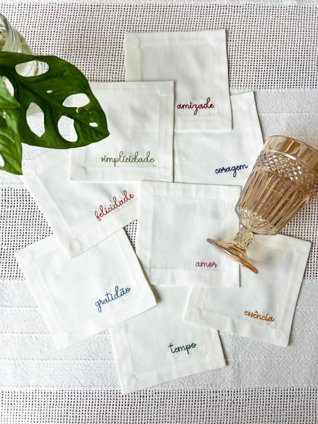 Cada porta-copo tem um bordadinho com uma palavra diferente: felicidade, gratidão, simplicidade e amor, amizade, coragem, tempo e essência.